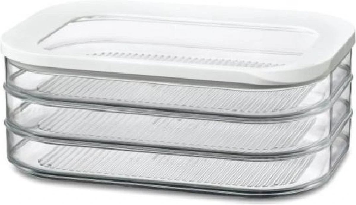 Mepal Modula 550/3. Soort: Doos, Vormfactor: Rechthoekig, Inhoud: 1,65 l. Breedte: 160 mm, Diepte: 224 mm, Hoogte: 86 mm. Aantal per verpakking: 1 stuk(s) De vleeswarendoos Modula van Mepal 550/3, voorzien van een doorzichtige deksel met witte ring. De rechthoekige Modula vleeswarendoos met afgeronde hoeken heeft een inhoud van 1650 ml en geeft direct zicht op inhoud, ook in de koelkast! De witte afdichtring zorgt voor een luchtdichte afsluiting, waardoor deze doos geschikt is voor het bewaren van diverse vleeswaren in 3 lagen. De Modula bewaar- en opbergdozen van Mepal zijn verkrijgbaar in verschillende maten en uitvoeringen, liggen goed in de hand en zijn makkelijk te openen. Bovendien zijn ze stapelbaar en vaatwasmachinebestendig. Hoe veeleisend u ook bent: Modula bewaardozen zijn erop berekend!